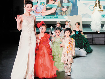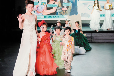 麦奎恩·秋(左一)与小学员们参加二〇二四洛杉矶儿童礼服秀。受访者供图