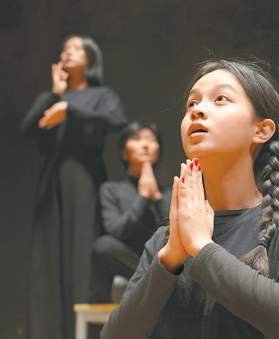 “我要带你到处去飞翔,走遍世界各地去观赏,没有烦恼没有那悲伤,自由自在身心多开朗……”话剧中,当祈祷通过征兵出去看世界的木兰收到征兵通知时,她在慌张无措中,吟唱起中文歌曲《张三的歌》。3名女演员动人的合唱歌声,让观众动容。