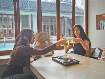 图为玛雅(右)和同伴在南浔民宿品尝“三道茶”。王 涵摄(人民视觉)