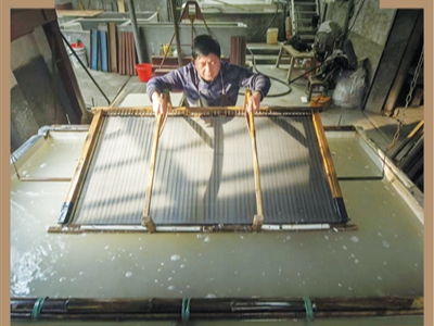 制作环节,同样要求高。“用石头缝里流出的山泉不间断洗料,才能避免杂质混入纸中,也有助于后续微生物的自然作用。”说罢,他道出家史,先辈在古代就从事造纸业,从外地来此,看中的便是青山常在、绿水长流。