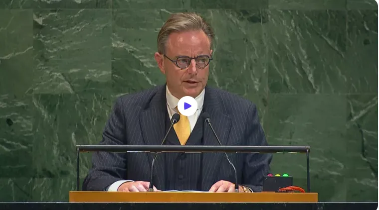 比利时首相巴特·德韦弗(弗拉芒民族主义者)周四在纽约联合国大会发表讲话。德韦弗先生在讲话中呼吁国际合作、自由贸易和尊重国际法。