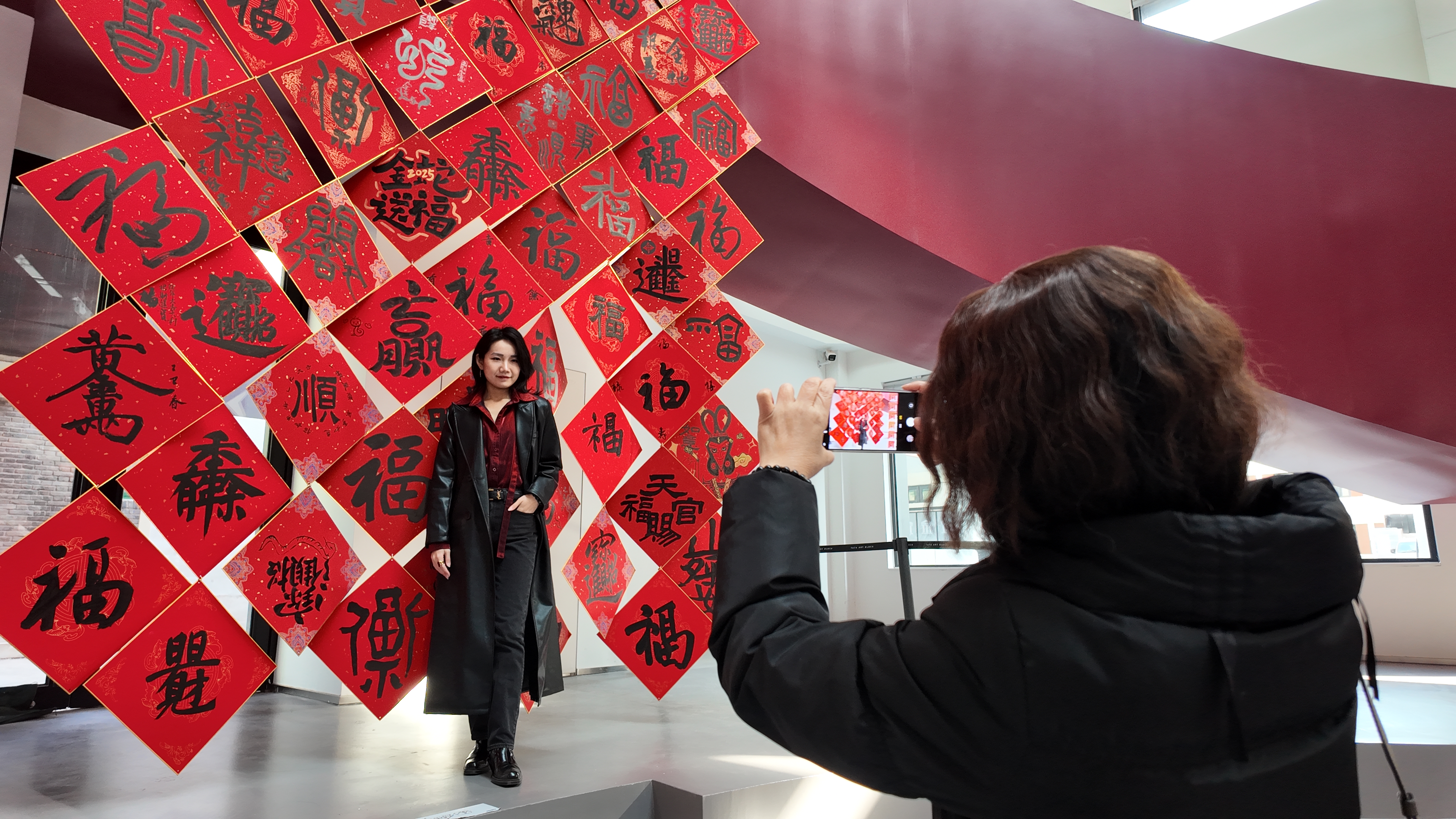 5日在天津舉辦的“天美年味”展覽上,創意蛇年書法百福牆成為“打卡”熱門地。雖然距離春節還有半個多月,但來拍照的年輕人不少。
