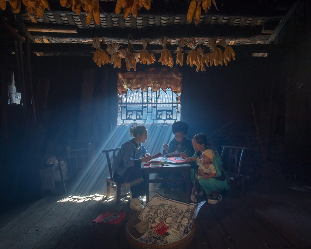 作品簡介:攝影地點-湖南湘西,攝影時間-2022年9月-描述湘西民間門簾、窗幔、服飾都有苗畫的蹤迹,照片是當地比較出名的苗畫師在爲村民苗畫的情景