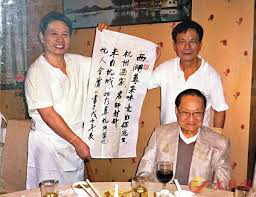 大文豪金庸先生在香港,就是杭州酒家的常客。他一生中只為杭州酒家題過字,寫下:「西湖蒓菜味,竟自碟底生,杭州酒家,名師材料。來自杭城,此乃真杭州菜也」,茖款是「杭人金庸」。吳瑞康清楚記得,金庸先最喜愛的杭州菜,包括東坡肉、龍井蝦仁等。在金庸的小說中還有對「叫化雞」的描寫,這是他的懷舊菜。吳端康說:「金庸曾經品嚐過我做的『叫化雞』,他說比杭州做的還好吃。」