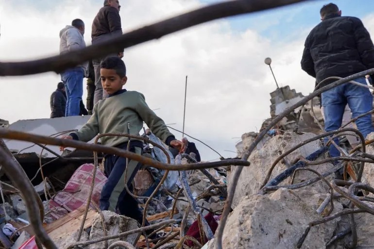 一具死者的屍體被用驢拉的車運送到拜特拉希亞倒塌建築物的廢墟附近