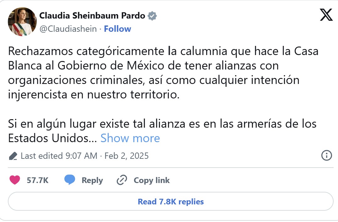 薛恩鮑姆在長篇貼文中表示「堅決反對白宮對墨西哥政府的誹謗」,強調墨國政府在4個月內查獲逾40噸毒品,當中包含2000萬劑芬太尼,並逮捕上萬名和販毒集團有關人士。