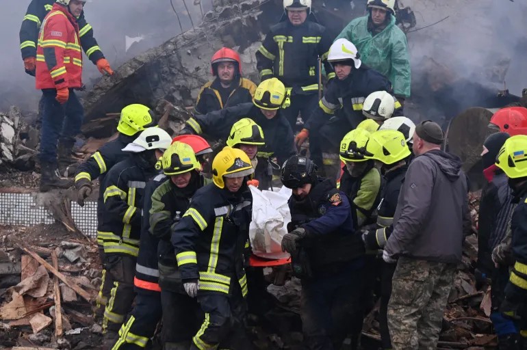 波爾塔瓦遭飛彈襲擊後,消防員抬著一名平民的屍體 (AFP)