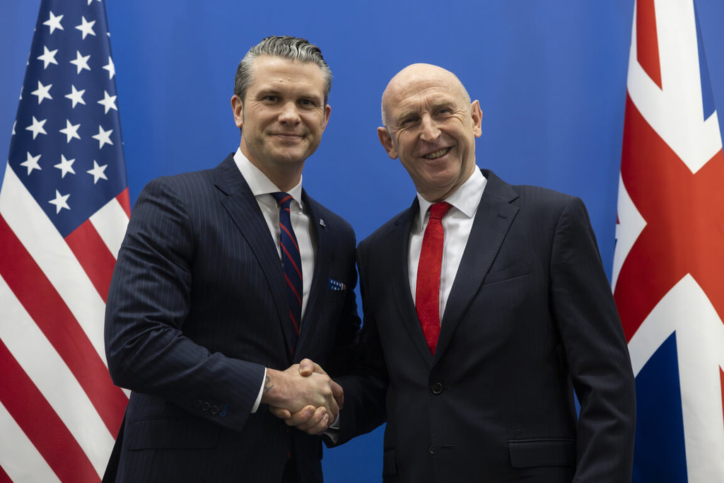 12日在布魯塞爾北約總部首度主持烏克蘭防務國際聯絡小組(UDCG)會議前,與美國國防部長赫格塞斯(左)舉行雙邊會談。(英國國防部提供).jpg)