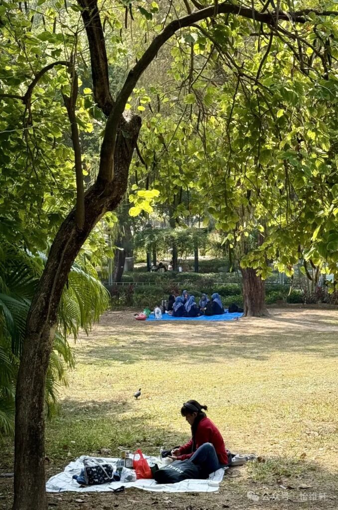在維園的樹蔭下,幾個女人坐在扁平的紙板盒上,交談著,分享著各自的故事和夢想。她們的聲音時而高亢,時而低語,伴隨著微風輕輕飄揚。草地上,孩子們嬉戲玩耍,偶爾傳來陣陣笑聲,仿佛這一切都與她們的歡樂相輝映。