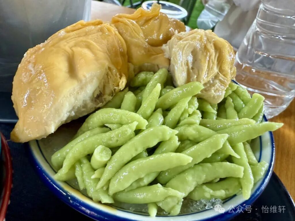 雅莉和女兒點了一碗「Mao Shan Wang Chendul」,這道冰品以「煎蕊」為基底,翠綠色的涼粉條滑嫩無比,仿若台灣的米苔目,清新而淡雅。然而,真正的主角卻是那一大塊貓山王果肉,宛如榴槤界的愛馬仕。肉質柔軟,香氣四溢,每一口都如同在舌尖綻放,留下令人陶醉的餘韻。濃郁的香味讓我不得不隨後去買瓶綠茶,漱口以去其餘味。