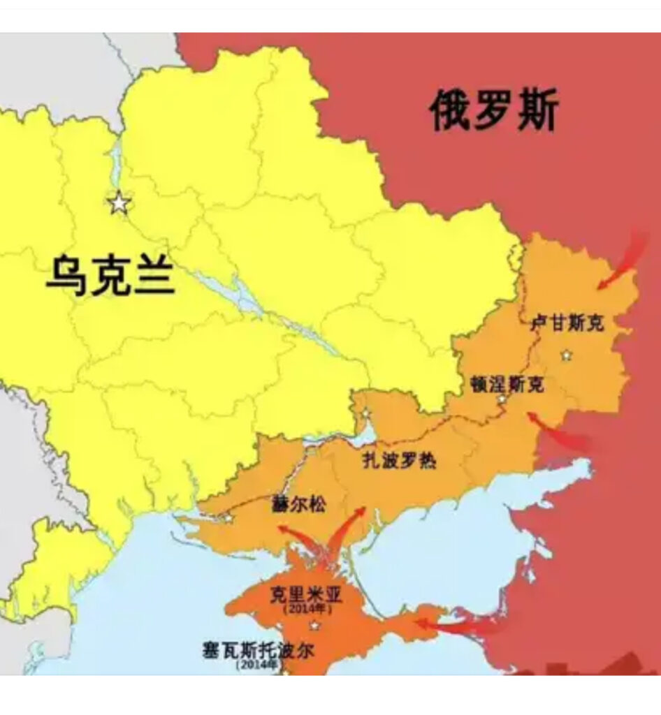 戰爭開始,俄軍大舉進攻烏克蘭首都基輔受拙,大批坦克被毀、人員傷亡嚴重!轉而攻佔烏東四州(盧甘斯克、頓涅茨克、扎波羅熱、赫爾松)!