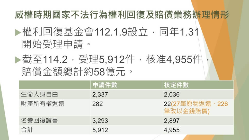 法務部自2022年5月底起辦理平復司法不法及行政不法事項,迄今已辦理8次平復公告並刊登行政院公報,至今已累積4925名政治受難者獲得平反,包括228事件受難者醫師潘木枝、畫家陳澄波、省參議員王添灯、檢察官王育霖、律師湯德章等人。