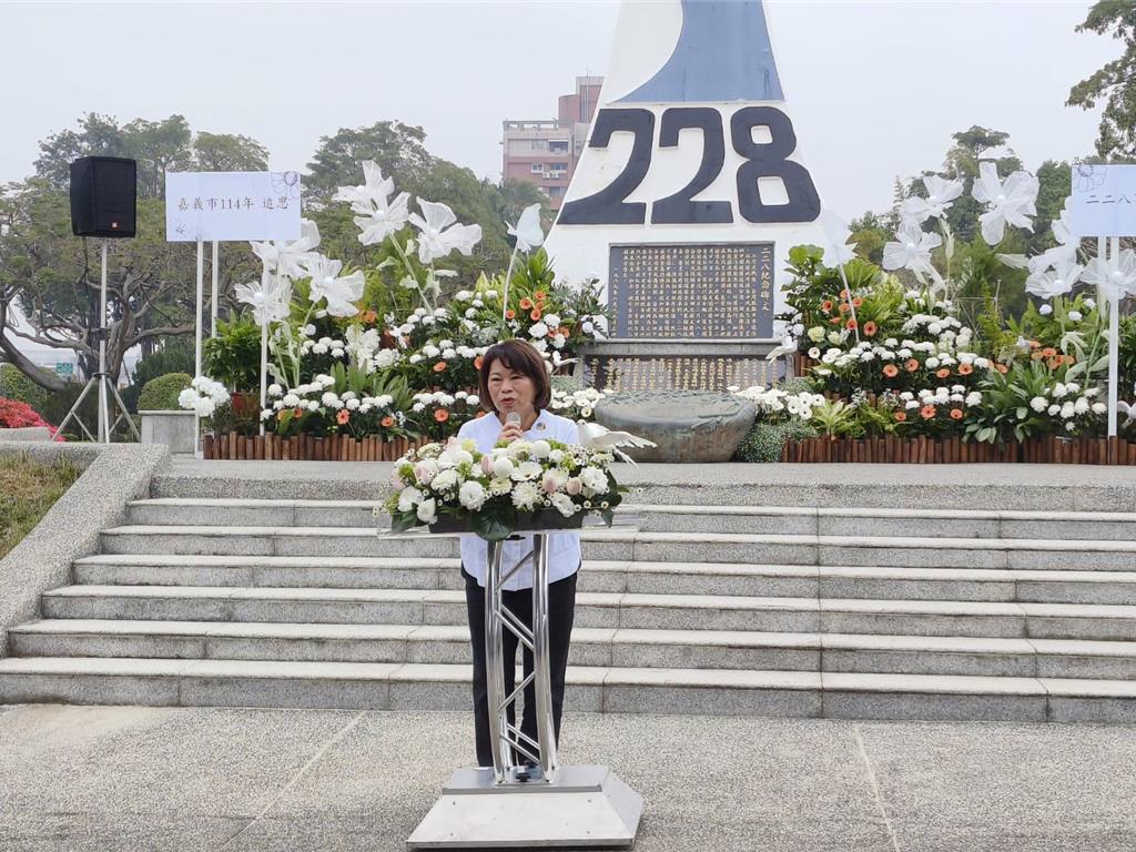 黃敏惠表示,228事件紀念日前夕眾人共同來追思,是對歷史的回顧,更是對公平、正義與和平的堅持,嘉義是228事件中受創最深的地區之一,前市長張博雅於1989年推動全台第1座228紀念碑在嘉義市落成,是對歷史傷痛的省思與警惕,提醒我們記取教訓,避免重蹈覆轍。