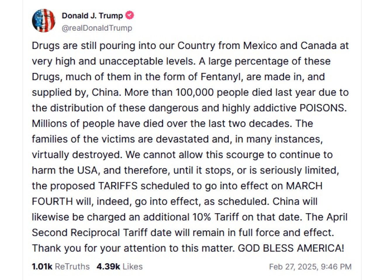 美國官員向法新社證實,新的10%關稅是因芬太尼問題而在目前關稅基礎上再加徵,稱遏阻毒品方面的「進展不足」。
