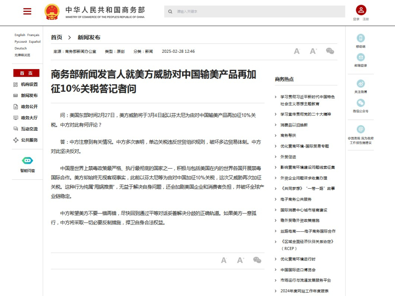 王文濤表示,近期美方以芬太尼等問題為由,對中國輸美產品加徵一成關稅,中方堅決反對,已採取相應反制措施,這是維護中方自身正當權益的必要之舉。中方亦注意到,美國總統特朗普上月20日簽署《「美國第一」貿易政策備忘錄》,其中多項調查針對中國,希望美方以客觀理性專業態度進行評估調查,提高透明度。