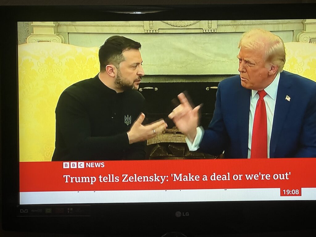 殊不知司機堅持不屈服、不投降、不割讓領土、不出賣礦產資源的立場。與川普爭論得面紅耳赤!川普甚至威脅全部退出,斷絕援烏!並指責司機會引發第三次世界大戰!會談很不愉快!總統談崩,司機憤而提早離場,雙方沒有按照慣例舉行記者會!