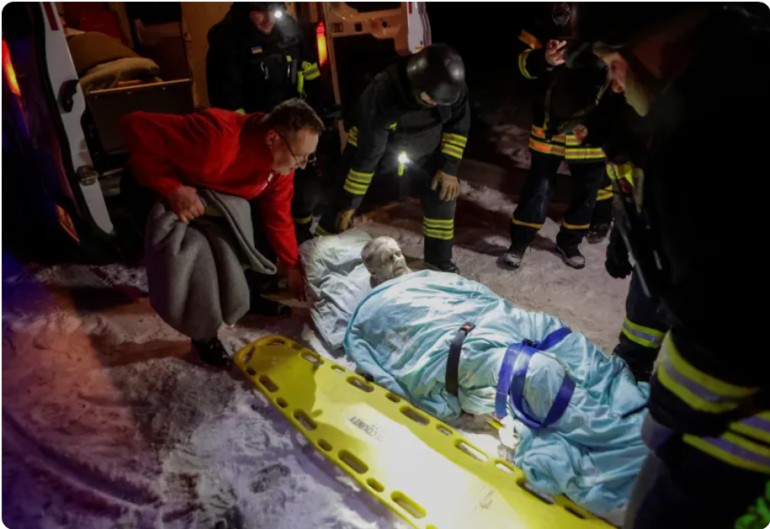 2025 年3 月1 日,救援人員和醫護人員從烏克蘭哈爾科夫一家遭俄羅斯無人機襲擊的醫院撤離一名病患(路透社)