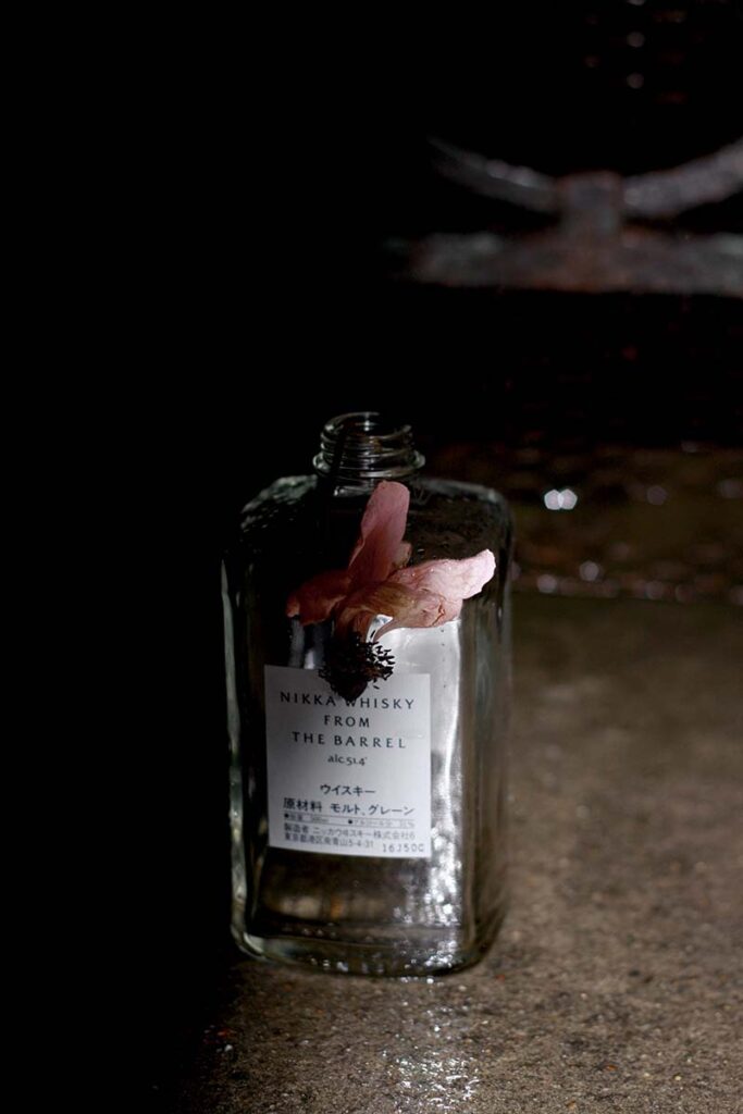 作品簡介:照片拍攝于2011年,巴黎。午夜下著小雨,我把這支插在威士忌酒瓶裏正在枯萎的花拿到陽台,呼吸夜晚潮濕的空氣。這支花從盛開時起就壹直住在這間房子裏,直到她的花瓣漸漸幹枯、壹瓣壹瓣離開她的身體,她仍舊以粉嫩的本色繼續她的生命。生命擁有枯萎的權利。枯萎同樣是活著的生命。