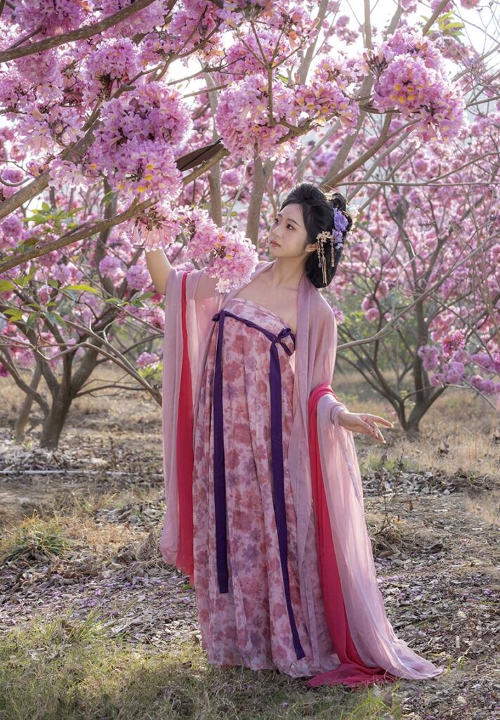 作品簡介:2025年1月5日,拍攝于廣東省江門市新會區綠美生態園,壹位身穿漢服的美女,陶醉于紫花風鈴樹下。