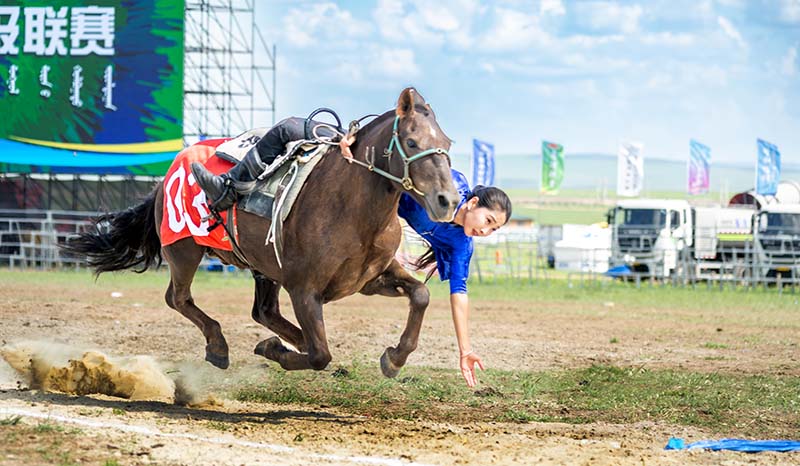 作品簡介:7月14日在內蒙古自治區第34屆草原那達慕上,進行的拾哈達比賽上,壹名參賽選手馭馬騰起,撿拾哈達。