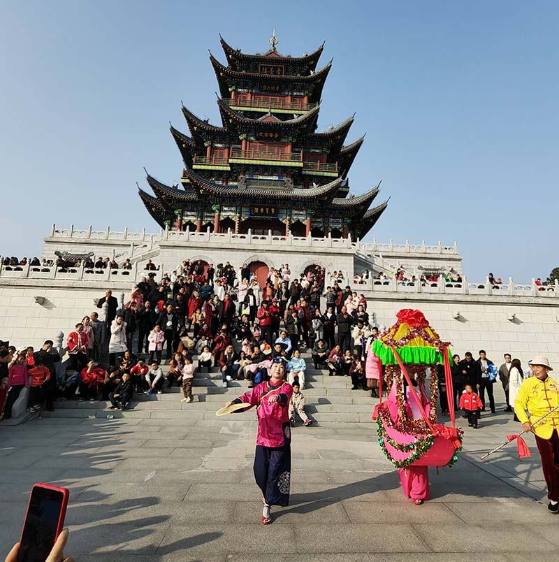 作品簡介:2025年1月29日,大年初壹,湖北省黃岡市麻城孝感鄉文化公園考善樓前,傳統戲采蓮船正在表演,扮演“船娘”的女藝人阿娜多姿,眉眼含笑,引得觀衆陣陣喝彩。