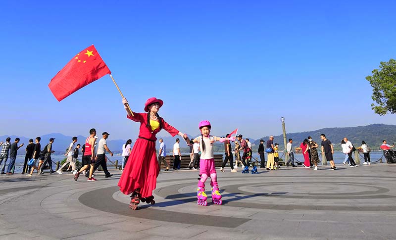 作品簡介:國慶節的早晨,杭州西湖邊壹對母女手舉國旗,腳踩滑輪歡快地轉著圈圈,好似優美的華爾茲。表達了對祖國生日的祝福,反映了我們的生活充滿陽光。