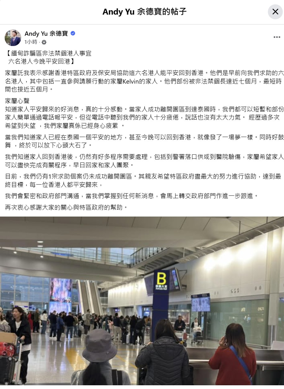 一直跟進事件的油尖旺區議會前副主席余德寶發文表示,獲救 6 名港人是曾接獲的求助個案,包括有一直參與請願行動的家屬,他代家屬表示感謝特區政府及保安局。