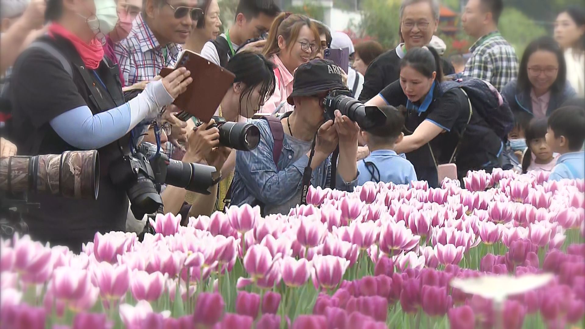 (中華新聞通訊社/中華時報3月14日)香港花卉展即日起一連十日在維園舉行,今年主題是「綻放英姿」。踏入春天,維園以一片色彩繽紛的鬱金香迎接市民。紅白相間的鬱金香優雅高貴,襯托今年花卉展主題花秋英。這六朵大秋英花由蘭花及康乃馨拼成,秋英花即使在貧瘠土地上也可生長,寓意生命力旺盛、綻放英姿。