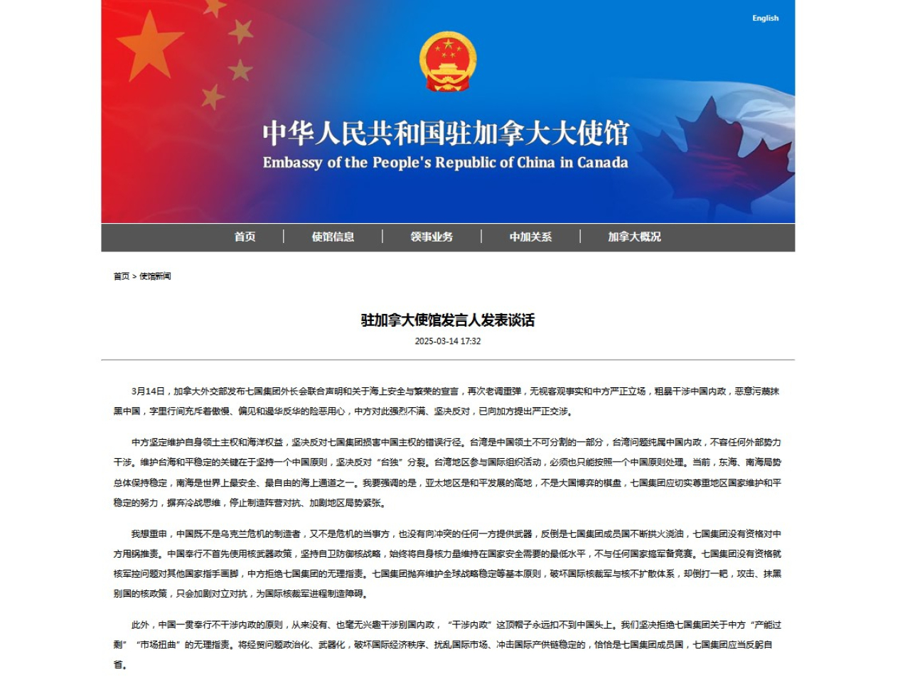 週五,中國駐加拿大大使館發言人在一份聲明中表示,七國集團的聲明“無視客觀事實和中方嚴正立場,粗暴干涉中國內政,惡意污衊抹黑中國”,並說中方“對此強烈不滿、堅決反對,已向加方提出嚴正交涉”。