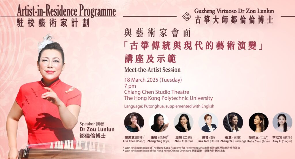 2025年3月18日,香港理工大學迎來了一場盛大的音樂盛會,著名古箏演奏家鄒倫倫博士在此舉辦的「與藝術家會面」講座,主題為「古箏傳統與現代的藝術演變」。該活動是香港理工大學2025駐校藝術家計劃的一部分,旨在提升大學生在傳統音樂藝術方面的學習體驗。