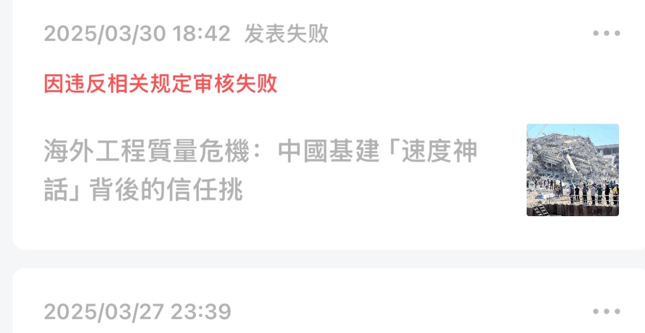 中華時報社長寫了篇相關文章《中國海外基建品質危機:從曼谷大樓倒塌到「一帶一路」的信任挑戰》在公眾號也發布不了,提示違反相關規定。