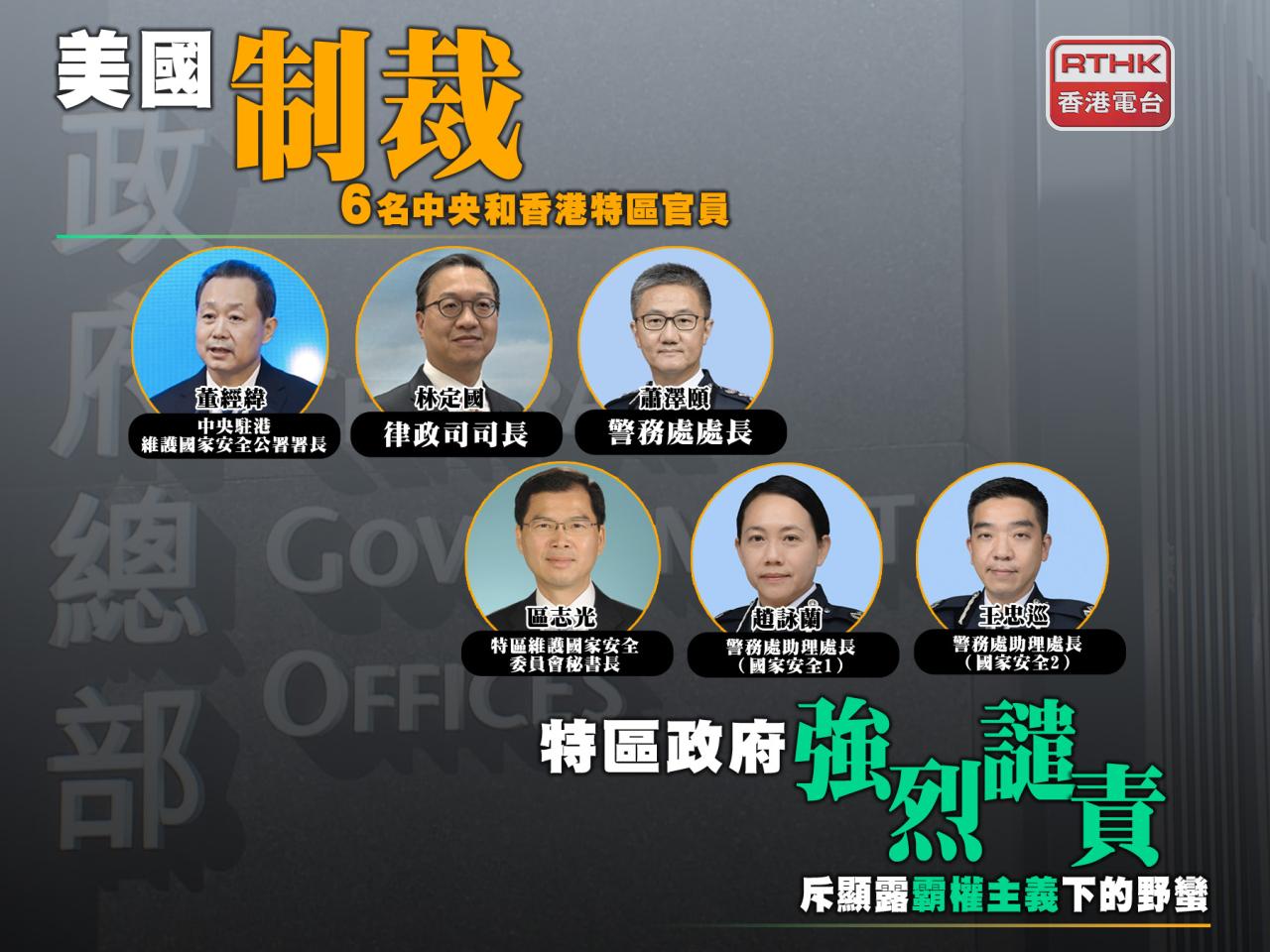 被美方點名制裁的6名北京中央駐港官員及香港特區官員,包括北京中央駐港國安署署長董經緯、香港律政司司長林定國、香港警務處處長蕭澤頤、香港維護國家安全委員會秘書長區志光、香港警務處助理處長王忠巡及趙詠蘭。指控他們依據《港區國安法》在境外進行跨國鎮壓,並壓製香港的公共自由。