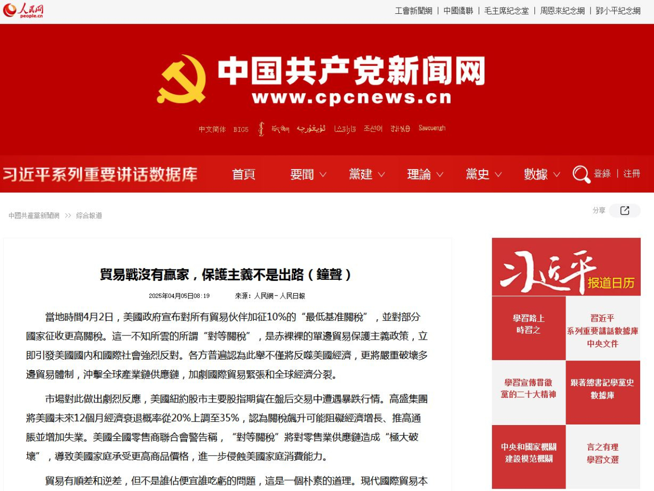 人民日報發表評論文章,批評美國不知所云的所謂「對等關稅」,是赤裸裸的單邊貿易保護主義政策,不僅將反噬美國經濟,更將嚴重破壞多邊貿易體制,衝擊全球產業鏈供應鏈,加劇國際貿易緊張和全球經濟分裂。