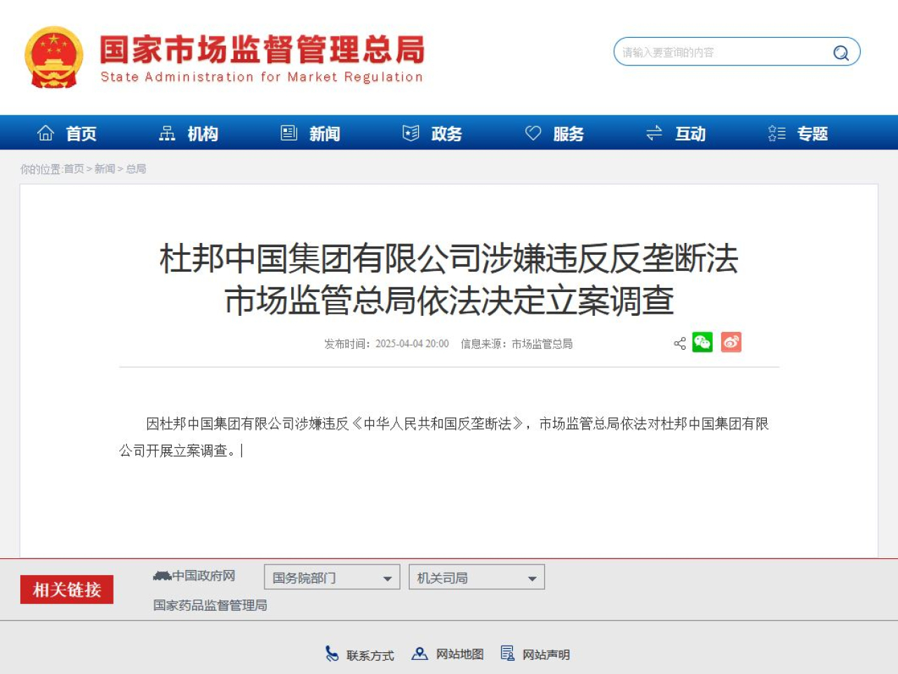 同樣在當天,市場監管總局宣布,因杜邦中國集團有限公司涉嫌違反《中華人民共和國反壟斷法》,市場監管總局對該公司進行立案調查。杜邦中國是美國化工業巨頭杜邦公司的子公司。