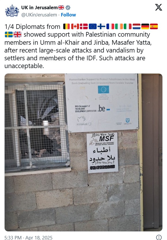 英國駐耶路撒冷領事館在X上發布了一條帖子,稱包括比利時、法國、西班牙和德國在內的多個國家的外交官在被佔領的約旦河西岸發生定居者襲擊事件後,「對巴勒斯坦社區成員表示支持」。