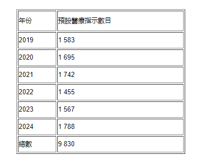 (一)根據《條例》,在《條例》生效前訂立或簽發的原有預作決定文書,如符合特定要求,則在《條例》生效後繼續維持有效和適用。二○一九年至二○二四年期間,在醫管局訂立的預設醫療指示數目按年表列如下: