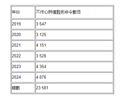 二○一九年至二○二四年期間,在醫管局簽發的不作心肺復甦術命令數目按年表列如下: