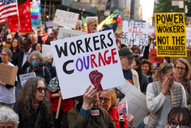 全球數千人週四參加五一國際勞動節工會示威活動,要求提高工資、改善工人狀況、縮短工作時間和提高退休金。