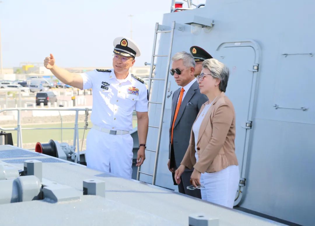 張大使參觀軍艦並親切慰問官兵,對艦艇技停阿聯酋阿布達比表示熱烈歡迎,強調全體官兵以昂揚向上的精神面貌和扎實過硬的軍事素質高效完成各項護航任務,充分向世界展示了人民海軍開放、自信、自強的良好形象,對一路劈波斬浪、勇闖遠洋大海的第47批護航編隊全體官兵致以崇高敬意。希望大家勇往直前,繼續堅定維護國家海外利益,持續開展兩軍友好交流,不斷向世界展示人民海軍邁向深藍的堅定步伐。