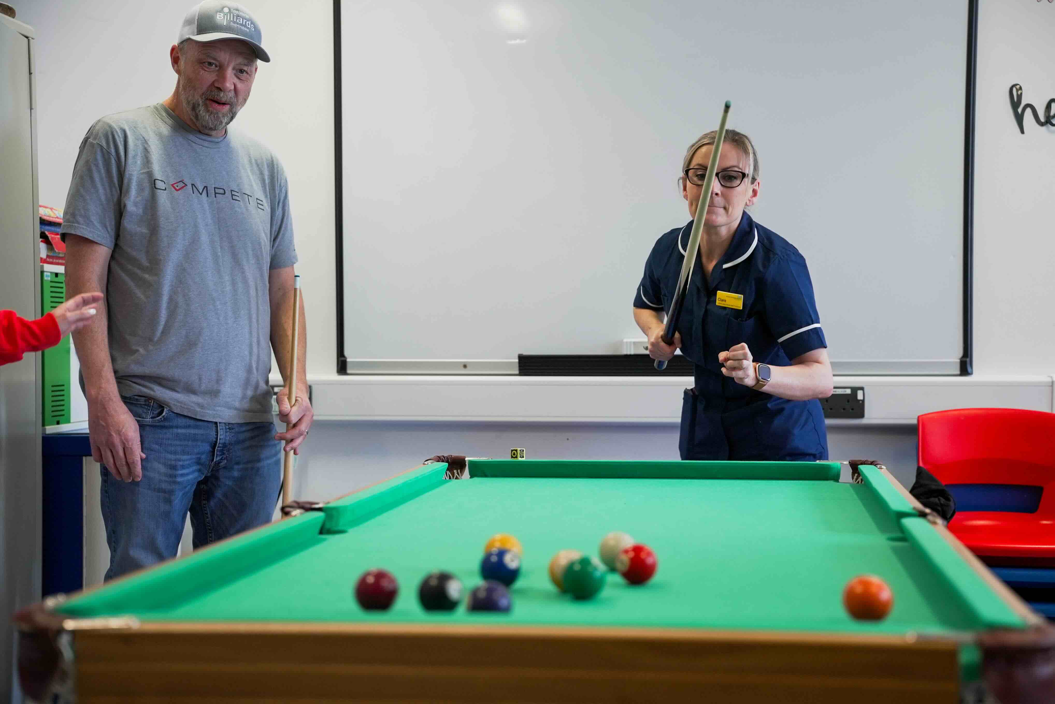他们与病房里的小患者及其家属亲切交流,讲述九球台球的魅力和正在举行的赛事,为孩子们带来了一段温馨、轻松的时光。病房配有一张半尺寸的台球桌,琼斯现场展示球技,激发了不少兴趣。