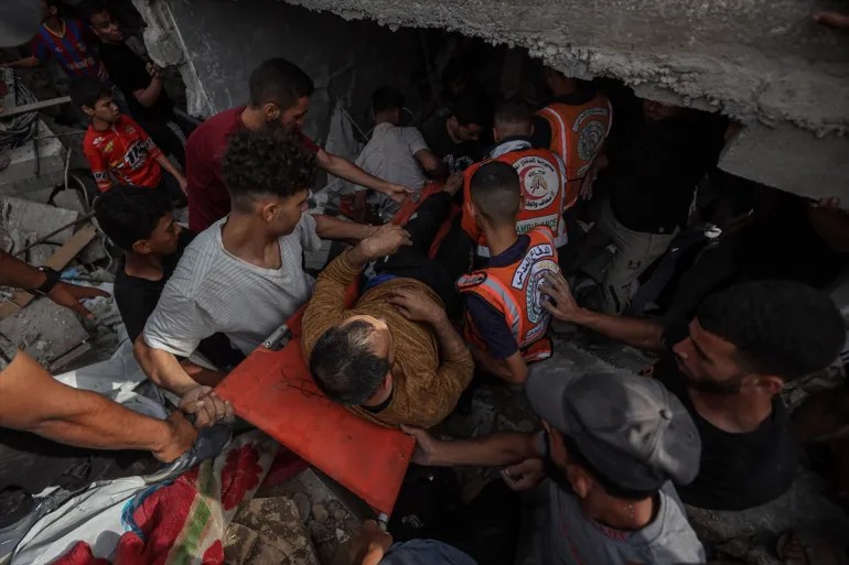 照片:巴勒斯坦人從賈巴利亞的廢墟中救出倖存者