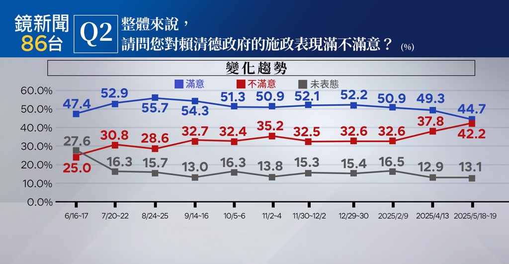 《鏡新聞》今(21日)公布5月政經民調結果,其施政滿意度有44.7%的民眾表示滿意、42.2%民眾表示不滿意,滿意度與上月相比下降4.6%,不滿意度上升4.4%;從變化趨勢也可看出,賴的滿意度創下就任以來歷次民調新低,不滿意度則是新高。