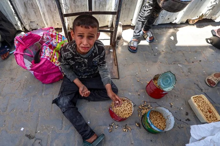 2025年5月21日,一名巴勒斯坦男孩坐在加薩中部努塞拉特難民營食品分發點的食品容器旁哭泣 (AFP)