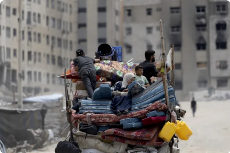 2025年5月22日,以色列軍方下令撤離加薩走廊北部後,巴勒斯坦人帶著家帶口逃離家園(路透)