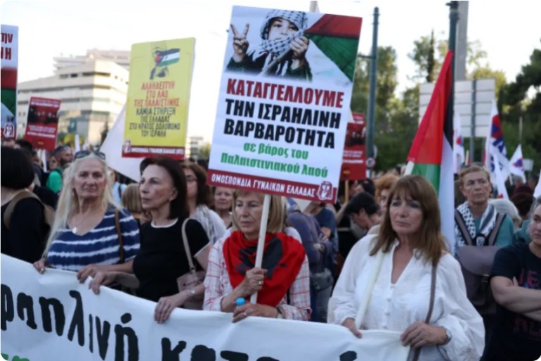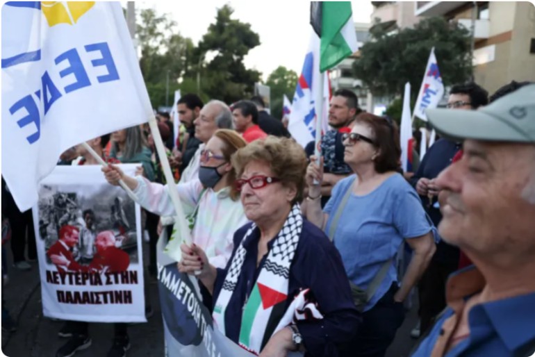 週四,人們在希臘雅典的以色列大使館外舉行示威活動,反對以色列對加薩的戰爭(阿納多盧通訊社)