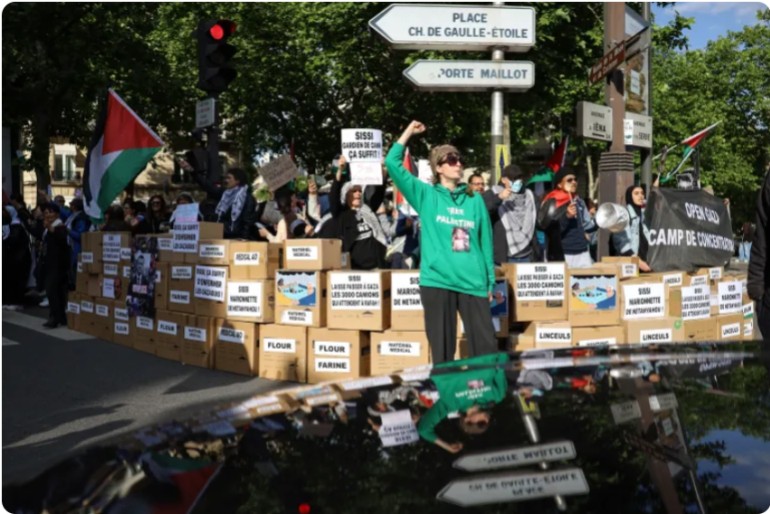 週四,人們聚集在法國巴黎的埃及大使館附近,抗議以色列對加薩的戰爭,並敦促埃及總統塞西為人道主義援助卡車進入加薩提供便利(阿納多盧通訊社)