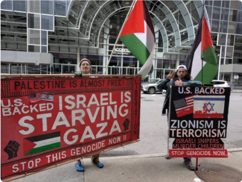 週四,抗議者在美國伊利諾伊州芝加哥的以色列領事館前舉著標語和巴勒斯坦旗幟(阿納多盧通訊社)