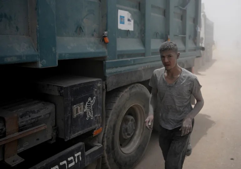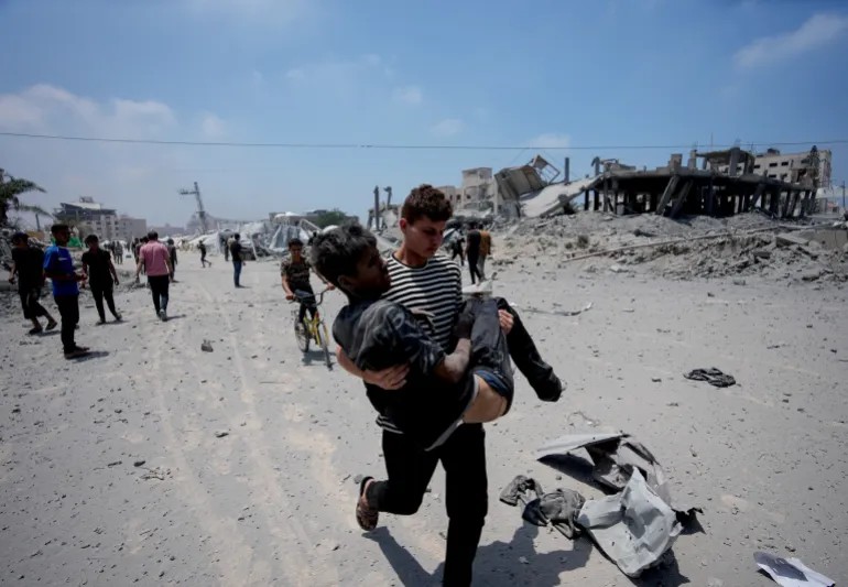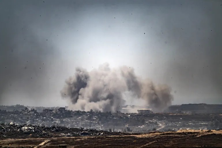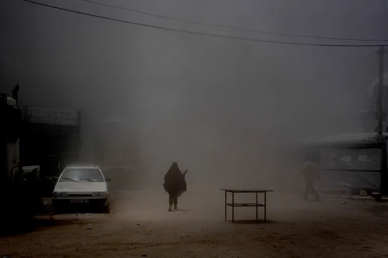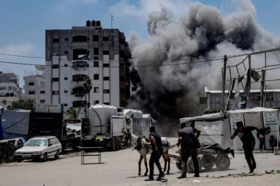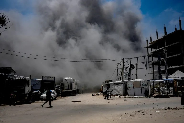 2025年5月23日,在安薩爾地區發出警告後,以色列軍隊襲擊了加薩地帶西部流離失所的巴勒斯坦人疏散的建築物,煙霧瀰漫,塵土飛揚,人們四處逃散