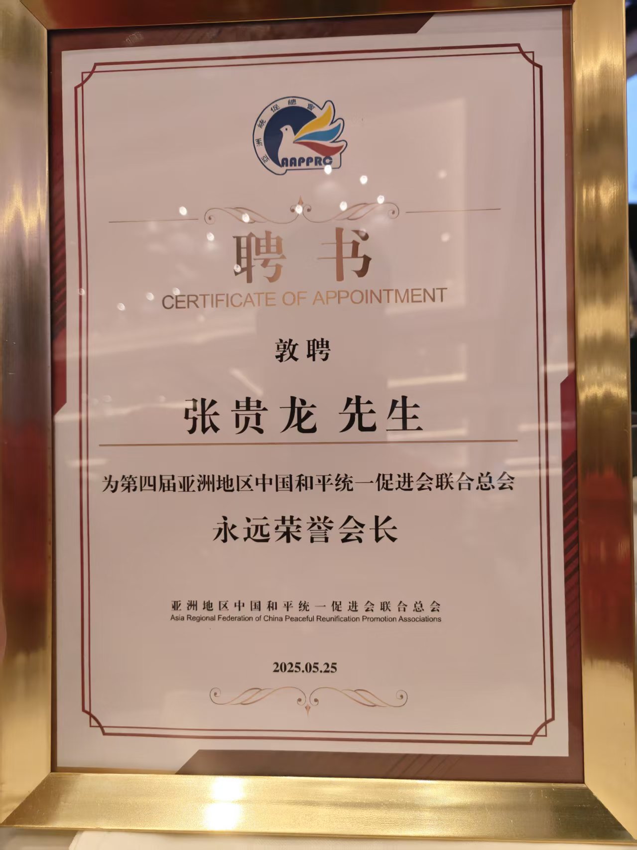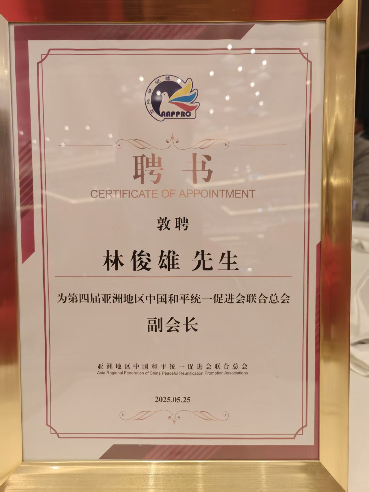 在換屆慶典環節,老撾中國和平統一促進會會長張貴龍先生憑藉長期致力於團結海外同胞、推動兩岸交流的卓越貢獻,被敦聘為亞洲地區中國和平統一促進會聯合總會永遠榮譽會長。同時,老撾中國和平統一促進會執行會長林俊雄先生獲任第四屆聯合總會副會長。林俊雄先生多年來積極凝聚老撾華人華僑力量,組織愛國主題活動,搭建中老民間友好橋樑,為促進祖國統一事業作出表率。聯合總會高度評價其“以僑為橋”的實踐成果,稱其為推動反“獨”促統事業注入新動能。