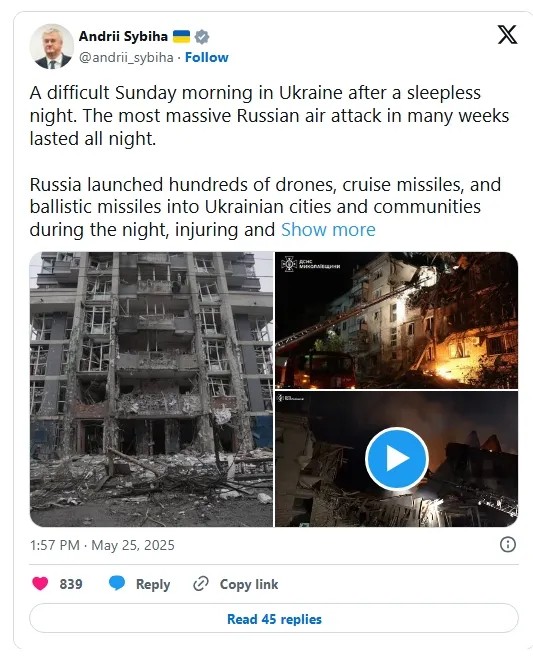 烏克蘭空軍則在25日指出,俄羅斯在夜間對烏克蘭各城市發射298架無人機及69枚飛彈,包括首都基輔,造成13人死亡、數十人受傷;就發射武器而言,這是開戰來對烏克蘭發動的最大規模空襲。雖然其它空襲造成的死亡人數更多。烏軍則擊落了俄方45枚飛彈和266架攻擊無人機。